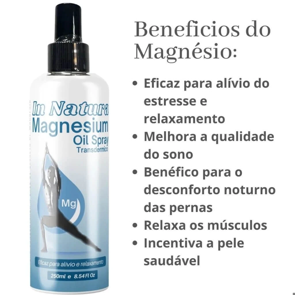 Saúde Muscular: O magnésio é fundamental para o funcionamento adequado dos músculos, ajudando a reduzir cãibras, fadiga e promovendo a recuperação após atividades físicas intensas. Aplicado diretamente na pele, o óleo de magnésio é rapidamente absorvido, oferecendo resultados eficazes e naturais.